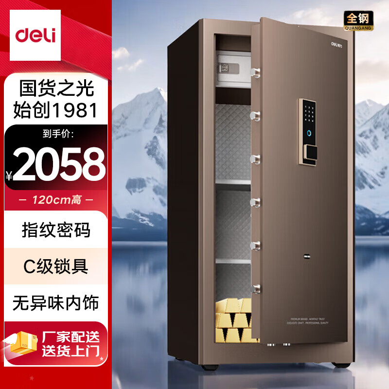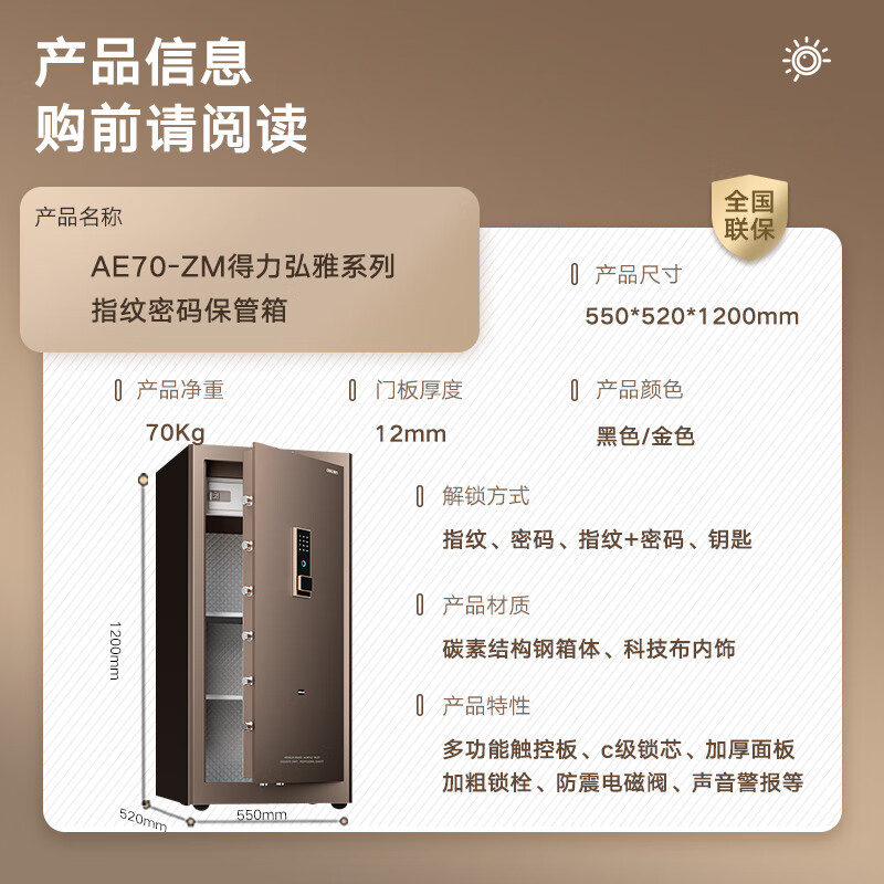 得力保险柜 家用办公指纹电子密码保险箱 大型防盗密码箱 科技布内饰 120CM金色 弘雅AE70-ZM价格:2088.00元!