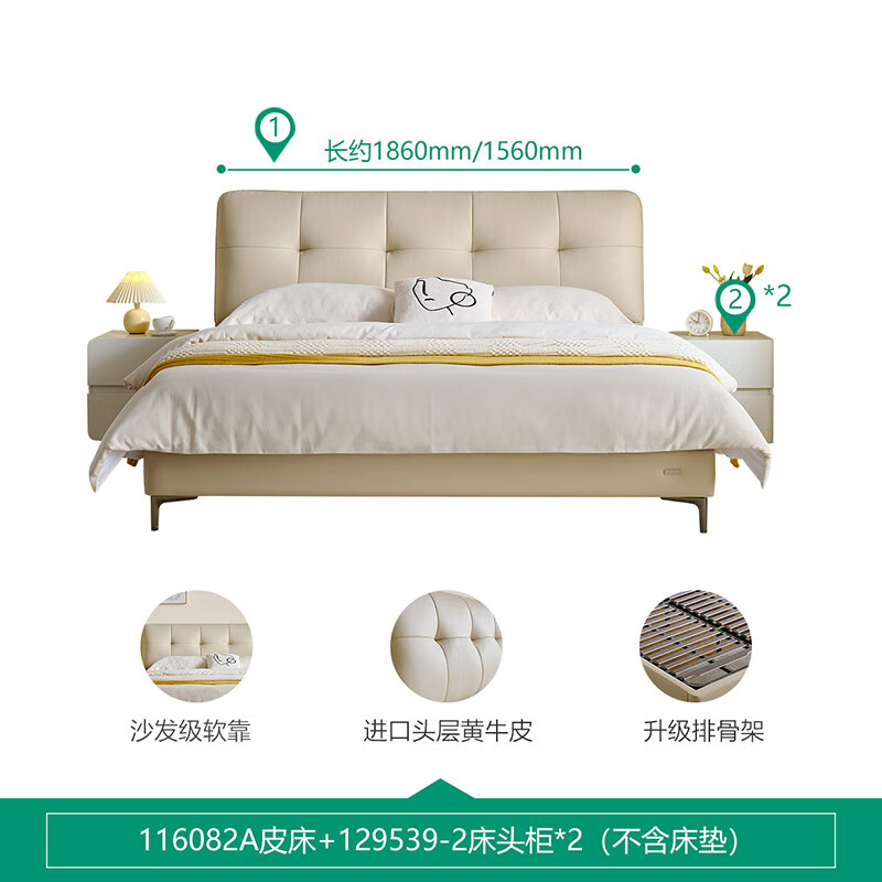 全友家居 头层牛皮真皮床奶油风软包床头主卧室床1.8米双人大床116082价格:3855.71元!