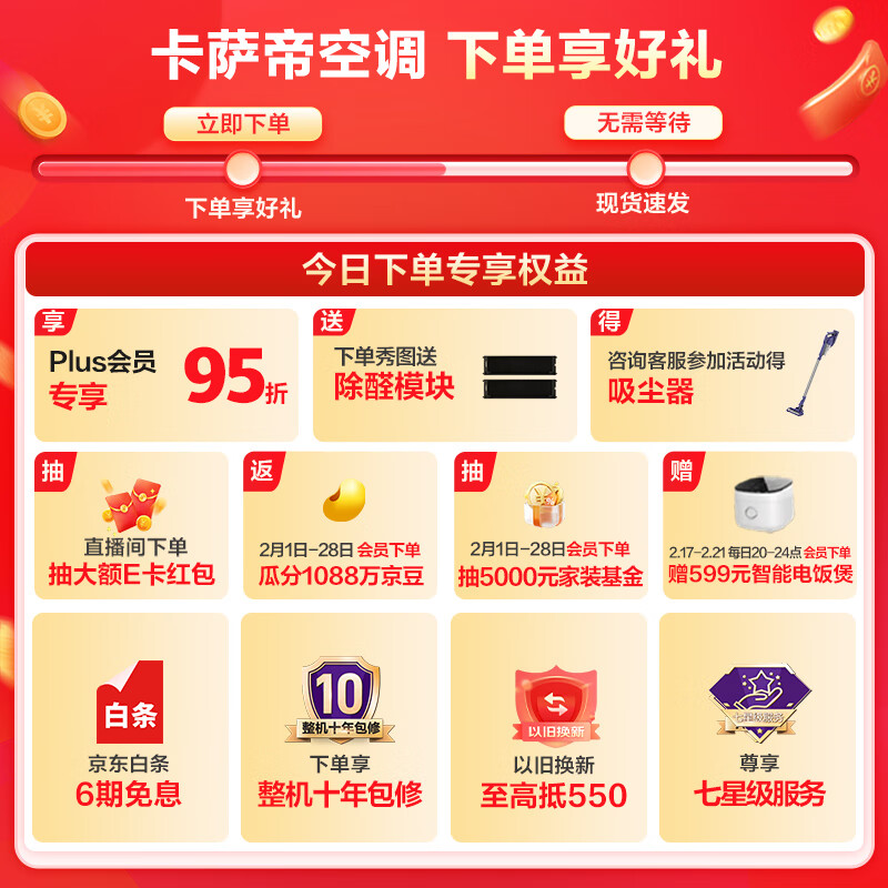 1、京东物流发货好快啊,隔日就收到了。卡萨帝空调确实很不错,比我以前家里用的奥克斯空调好太多了。静音又然后送风量也很大还,还很智能。整体很满意,会推荐给朋友的!