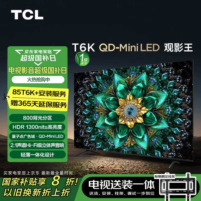 TCL 85T6K 包安装版【固定挂架送装一体】85英寸 QD-Mini LED电视 T6K+安装服务含挂架价格:6298.00元!