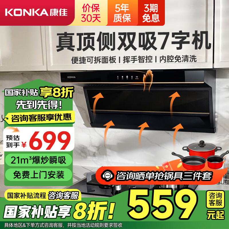 康佳(KONKA)顶侧双吸抽油烟机7字型 21立方爆炒大吸力政府补贴 宽屏拢烟挥手智控自清洗柔光顶灯 CXW-288-KL69价格:695.00元!