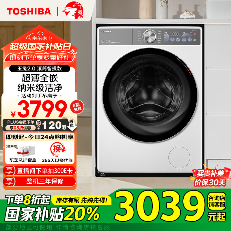东芝(TOSHIBA)滚筒洗衣机全自动家用【玉兔2.0DG-10T19BI】超薄全嵌 10公斤大容量智投 以旧换新家电补贴20%价格:3799.00元!