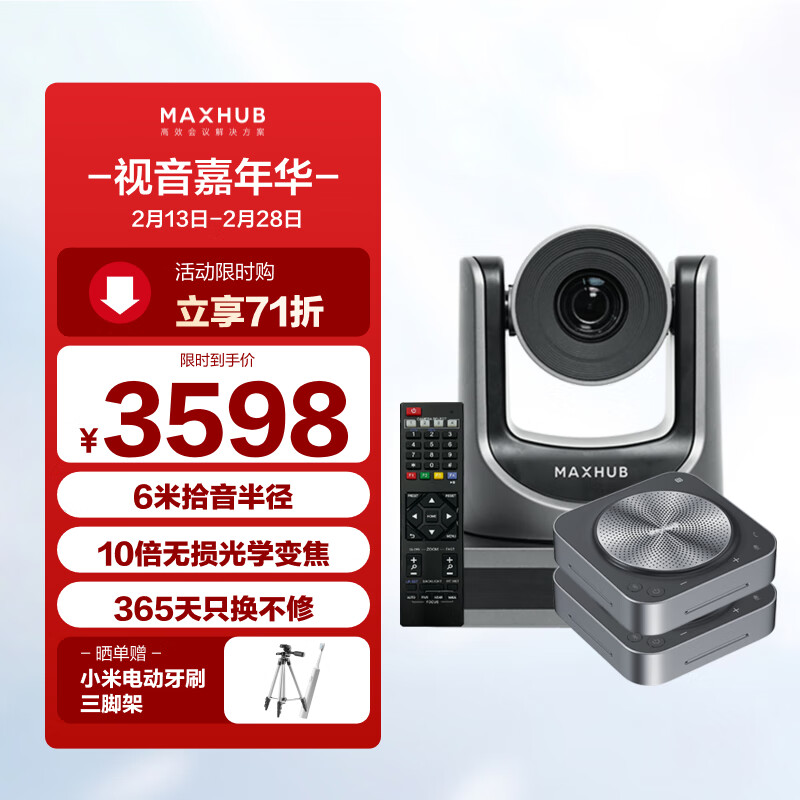 MAXHUBMAXHUB视频会议全套系统10倍光学变焦高清云台摄像头+全向麦克风6米拾音*2会议解决方案20-60㎡价格:3598.00元!
