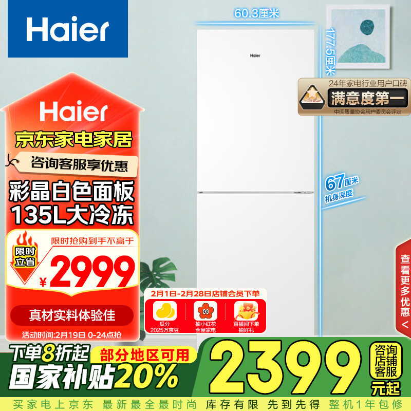 2、给家里老人买的,这是买的第二个海尔冰箱了,老人没有用软冻室的习惯,就买了一台两开门的,容积大,装的东西多,很不错老人很满意,京东物流也很给力