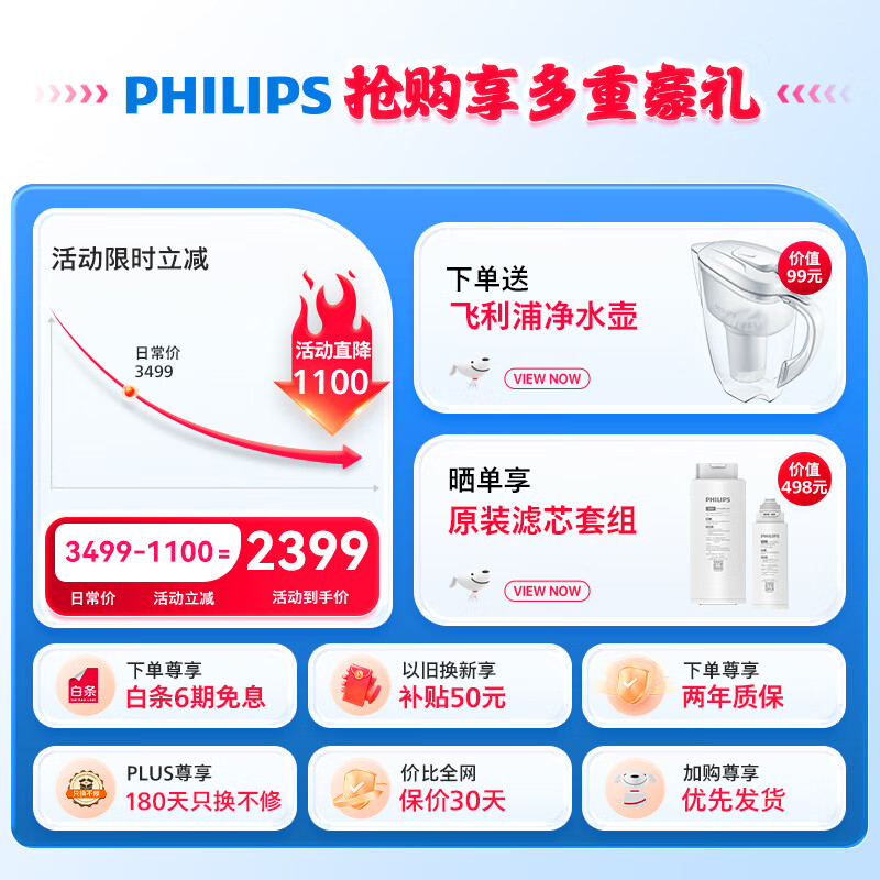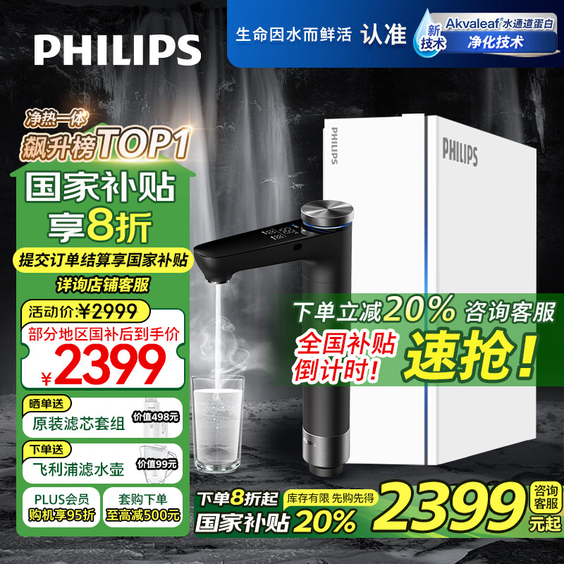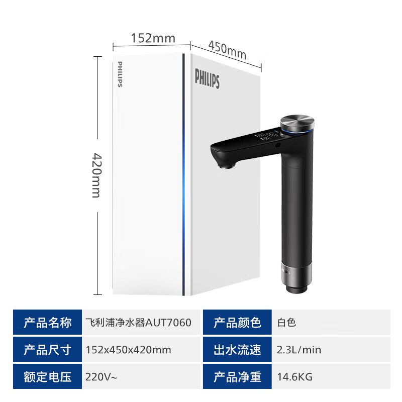 飞利浦(PHILIPS)净水器家用U22 Pro 5年RO反渗透矿化 母婴 2.3L/min智能即热龙头加热净饮机 AUT7060【补贴】价格:2999.00元!
