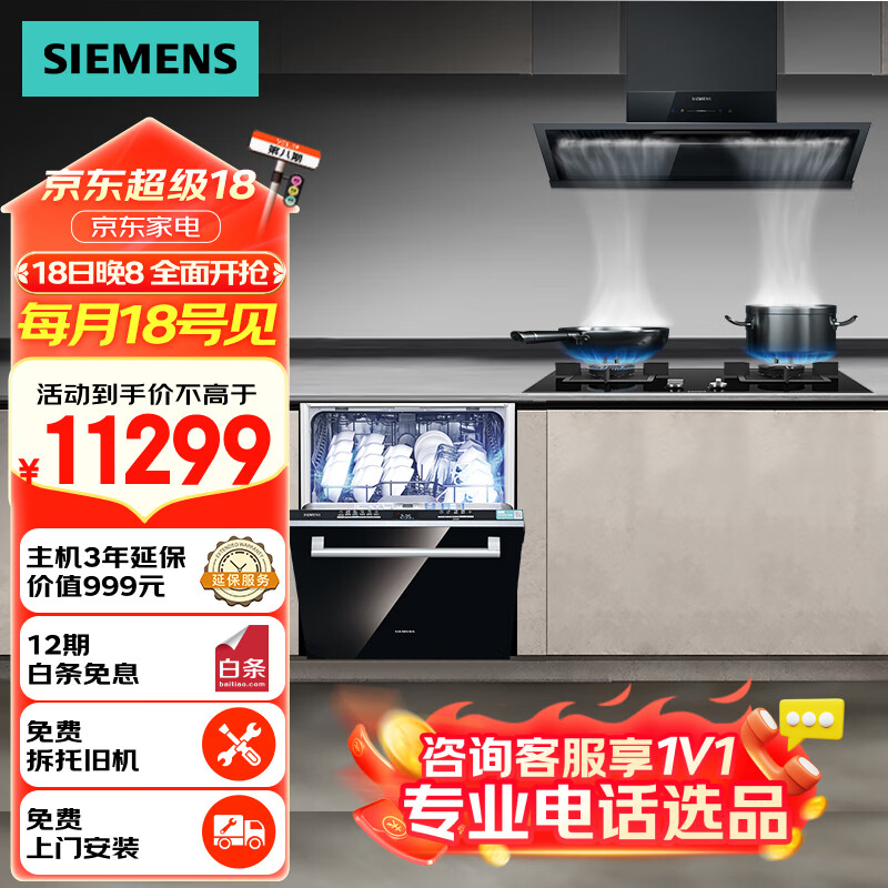 西门子(SIEMENS)超薄侧吸油烟机燃气灶14套大容量智能烘干洗碗机家用套装厨房三件套1B3BNW+23MP+SJ63E价格:11299.00元!