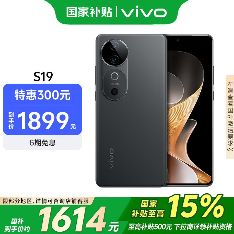 vivo S19 8GB+256GB 松烟墨 补贴 6000mAh超薄长续航 影棚级柔光环 第三代骁龙7 拍照 AI 手机价格:2199.00元!