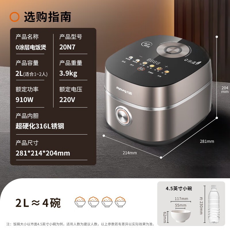 九阳(Joyoung)【2代0涂层】2升小型1-2人不粘电饭煲电饭锅10A口感点阵微坑水润膜IH电磁加热316L钢釜无涂层20N7价格:999.00元!