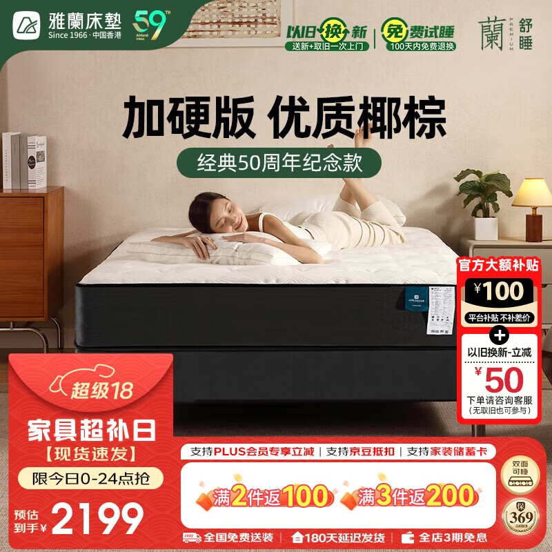 雅兰50周年纪念款 亲肤透气整网弹簧椰棕床垫 蘭朋友加硬版 1.5*1.9米价格:2599.00元!