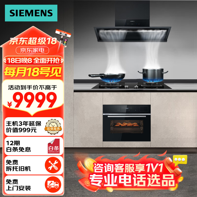 西门子(SIEMENS)超薄侧吸油烟机燃气灶蒸烤炸炖四合一套餐厨房三件套大风量吸油烟机5.0kW灶 1B3BNW+23MP+CS8J价格:9999.00元!