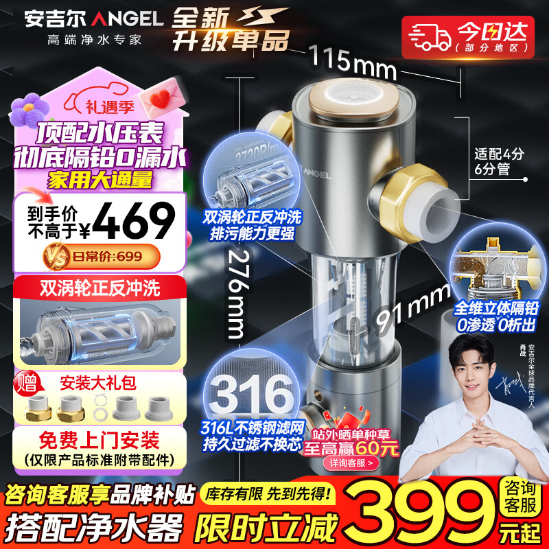 安吉尔前置过滤器前十名 半自动反冲洗防爆40微米自来水过滤器 8T全屋家用净水器J3526-GWG-6000价格:469.00元!