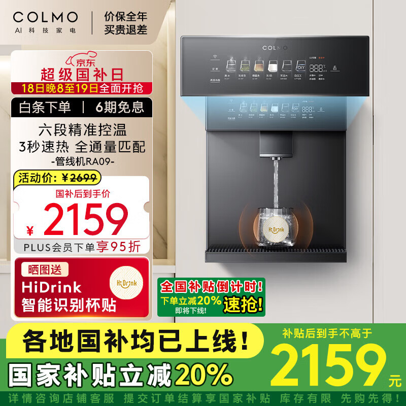 COLMO家用净饮机伴侣管线机壁挂式RA09饮水机高端 速热直饮全通量匹配高温杀菌智能感应取水价格:2699.00元!