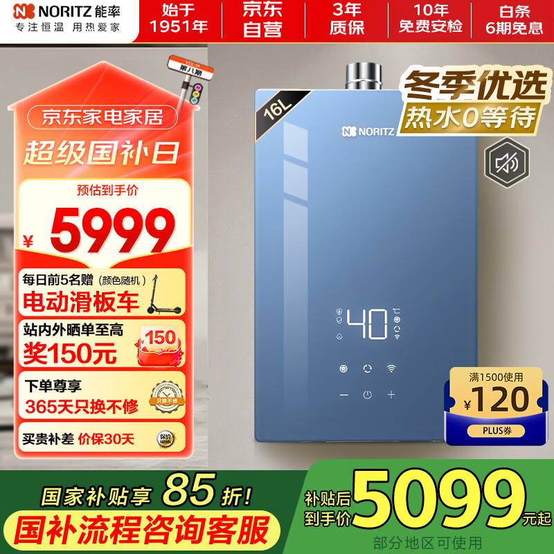 能率(NORITZ)零冷水燃气热水器16升 【补贴15%】双智控 幻彩系列屏 水量伺服器 GQ-16EX6AFEXQ天然气价格:5999.00元!