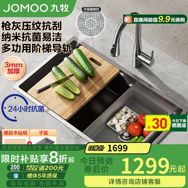 九牧(JOMOO)不锈钢枪灰压纹抗菌变轨水槽大单槽洗菜盆75*45不含龙头06284-9AZ价格:1359.00元!