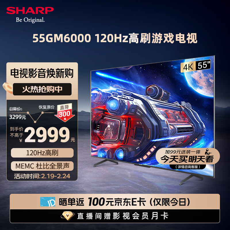 SHARP夏普电视55英寸120HZ高刷 杜比视界3+64GB 远声语音4K高清屏液晶游戏电视C55GM6000A价格:2999.00元!