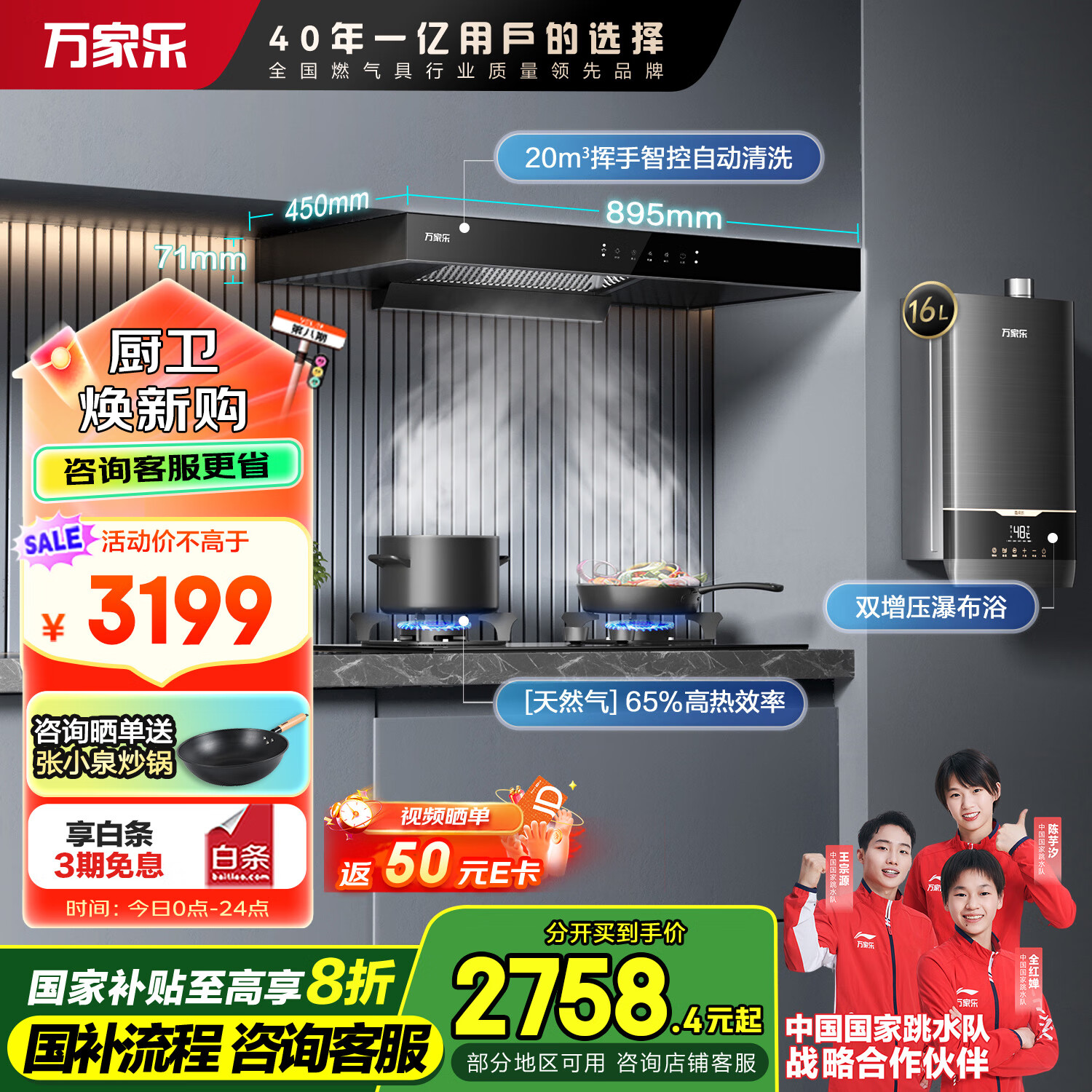 万家乐 抽油烟机 欧式20m3/min自清洗油烟机燃气灶热水器烟灶热厨卫三件套装AT051+KV061B+16LDLU3天然气价格:3199.00元!