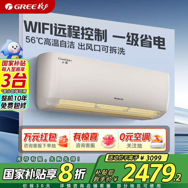 格力(GREE)1.5匹云恬一级能效变频冷暖壁挂式卧室挂机 格力空调KFR-35GW/NhAf1BG(珊瑚玉色) 家电补贴价格:3099.00元!