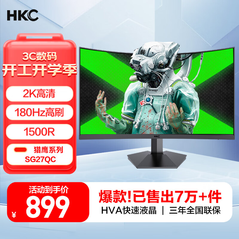 HKC 27英寸2K高清180Hz专业电竞1500R曲面屏HVA快速液晶适用PS5游戏吃鸡网咖电脑显示器 猎鹰SG27QC价格:999.00元!