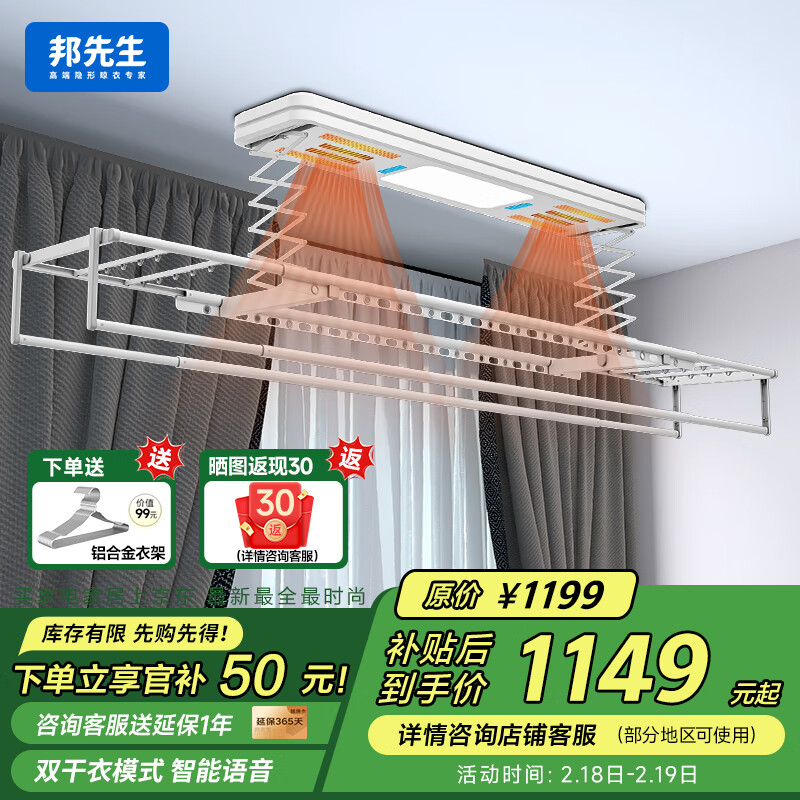 邦先生晾衣架电动智能全自动升降阳台凉杆晒衣架烘干消毒晾衣机M53CP白价格:1199.00元!