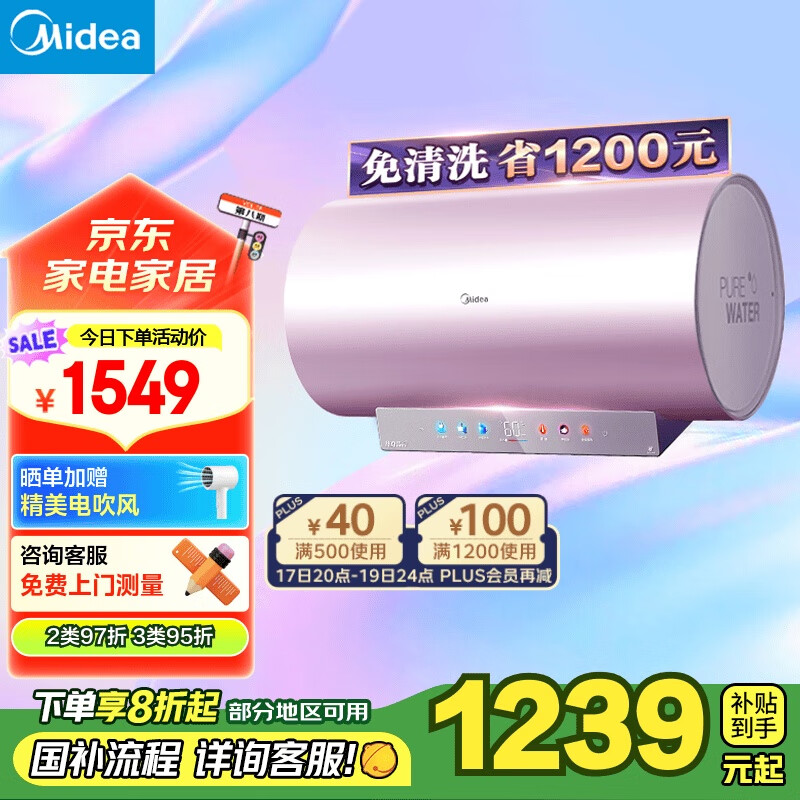 美的(Midea)免清洗电热水器60升家用 3300W变频 出水断电 镁棒免更换 阻垢 一级能效 以旧换新F6033-JE8(HE)价格:1549.00元!