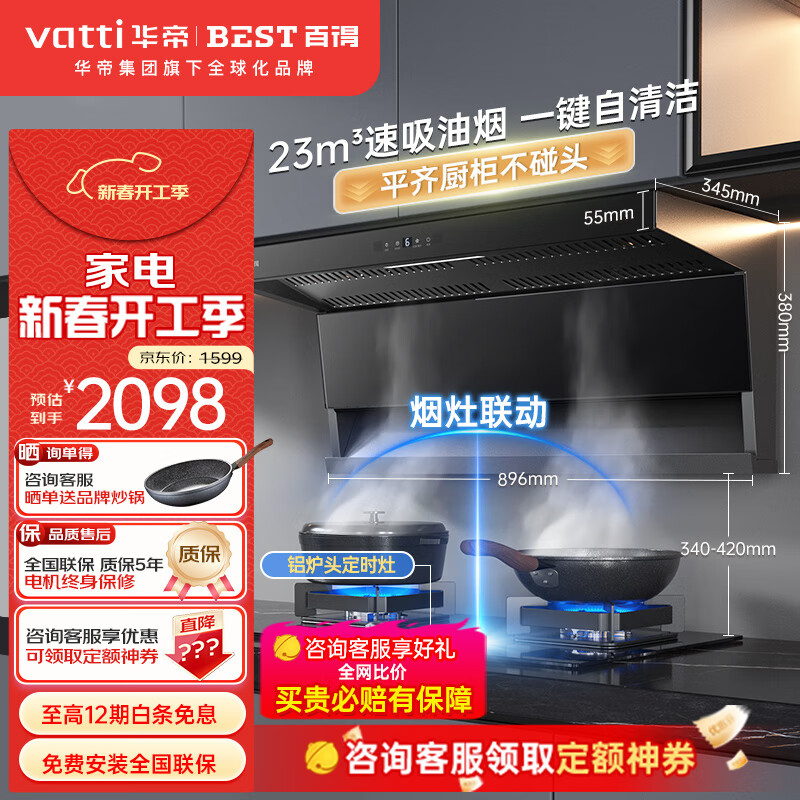 百得(BEST)顶侧双吸油烟机燃气灶具套装 23立方大吸力挥手感应自动洗 E632+QE73(天然气)【套装商品】价格:2098.00元!