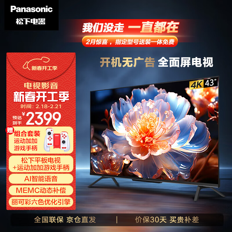 松下(Panasonic)电视LX580 43英寸 【游戏手柄套装版】 屏MEMC AI语音 开机无广告智能电视机 TH-43LX580C价格:2399.00元!