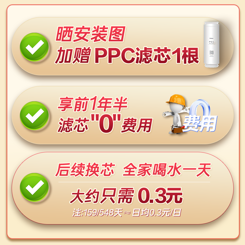 4、性价比高,师傅上门安装快,家庭用这款也就够了,外观也挺好看的,水质还是不错的,这下喝水也不用去大街打水啦,非常给力,推荐!