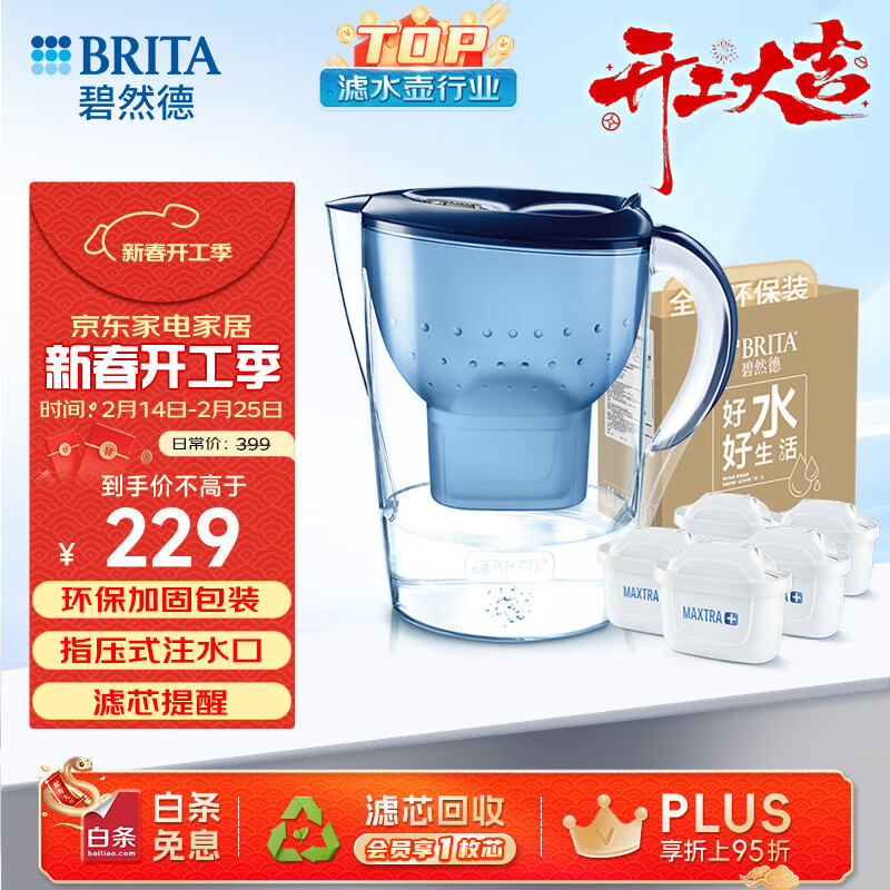 碧然德(BRITA) 过滤净水器 家用滤水壶 净水壶 海洋系列 3.5L蓝色 一壶六芯装 环保加固包装价格:229.00元!