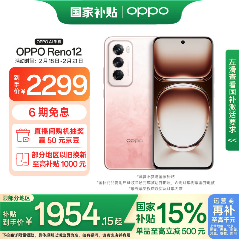 OPPO Reno12 12GB+512GB 柔和桃 超美小直屏 安卓Live图 政府补贴 游戏智能 AI影像 学生5G拍照手机价格:2299.00元!