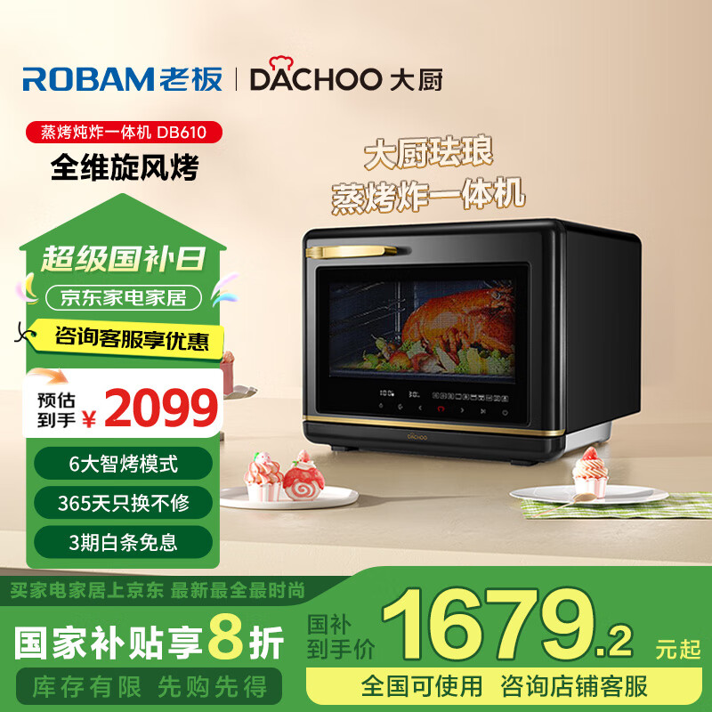 大厨老板电器【补贴】蒸烤炖炸一体机台式蒸烤箱家用厨房一体机珐琅内胆烘焙电烤箱DB610D松露黑价格:2099.00元!
