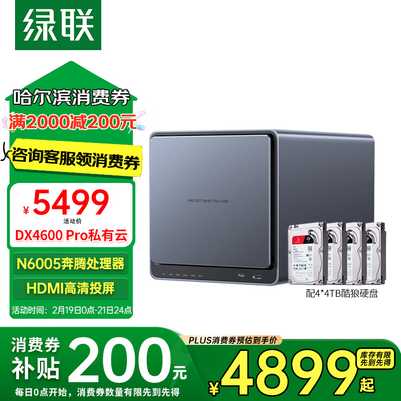 绿联 私有云DX4600 Pro 16T四盘位Nas网络存储硬盘服务器相册备份文件同步 手机扩容适用iPhone16价格:5499.00元!