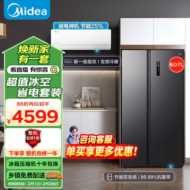 美的(Midea)冰空套装 慧鲜系列607升变频对开门冰箱BCD-607WKPZM(E)+1.5匹酷省电壁挂式空调KFR-35GW/N8KS1-1价格:5190.00元!