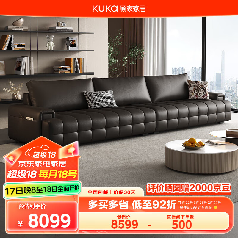 顾家家居(KUKA)劳伦斯沙发头层牛皮沙发客厅大户型别墅1219曜夜黑3.7M多人位价格:8599.00元!