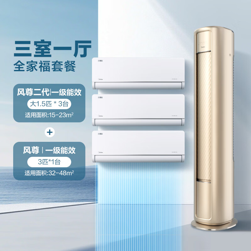 美的(Midea)空调 风尊系列 全家福套餐 三室一厅套装(大1.5匹风尊二代一级*3+3匹风尊柜机一级)价格:16596.00元!