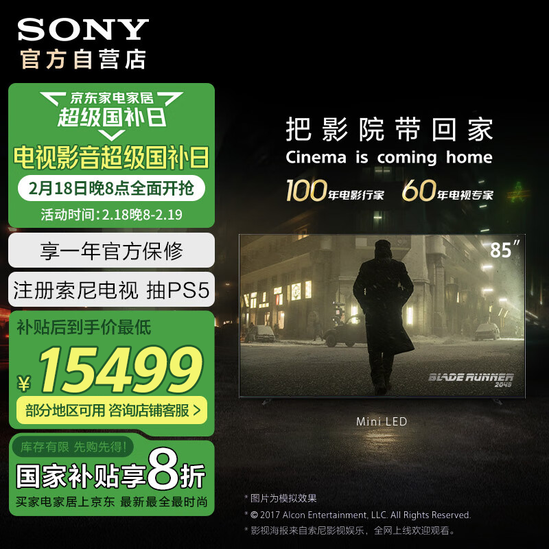 索尼(SONY)85英寸 索尼电视7系 MiniLED 电影感光影/原彩 22bit灰阶控制 XR芯片 85XR70 一级能效 以旧换新价格:17499.00元!