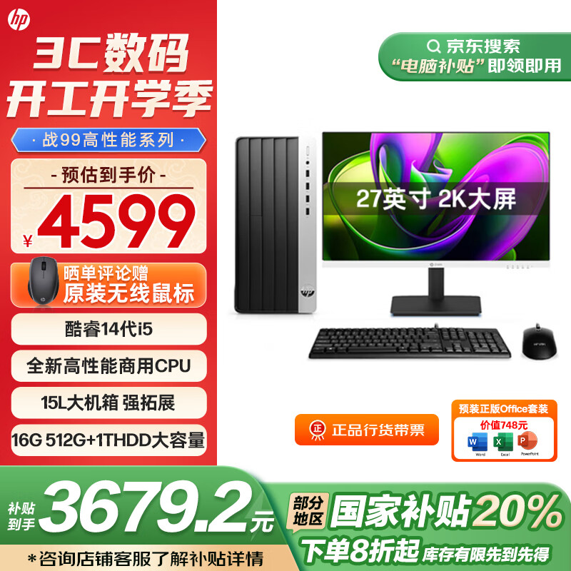 惠普 补贴 战99 高性能台式电脑主机 (14代i5-14500 16G 512G+1THDD) 27英寸2K大屏 办公学习机价格:4599.00元!
