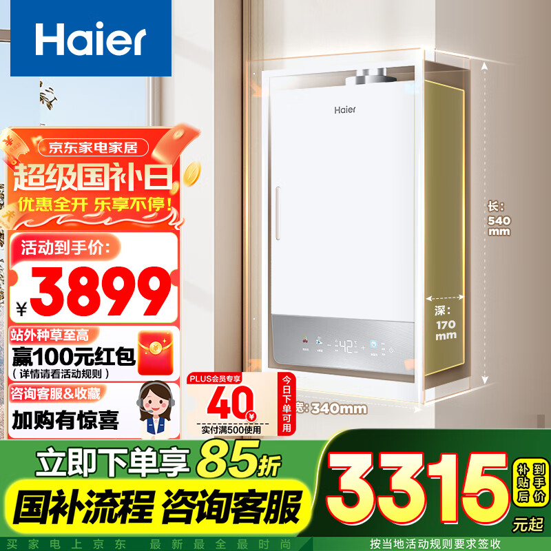 海尔(Haier)16升【国补立减15%】【白巧KU3】燃气热水器天然气 平衡式全密闭稳燃舱 自由嵌JSG31-16KU3FPXCU1价格:3899.00元!