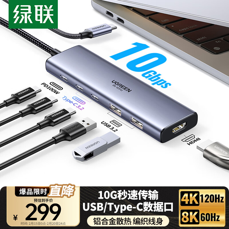 绿联Type-C3.2扩展坞8K60Hz雷电4拓展坞USB4.0高速10G转接头4K144Hz高刷转接器HDMI2.1适用华硕苹果Mac价格:299.00元!
