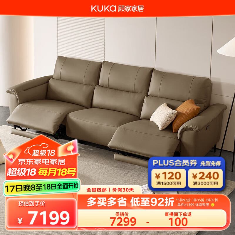 顾家家居(KUKA)零靠墙现代简约电动功能皮沙发客厅6196纳帕【橡木咖】3人2电动价格:7299.00元!