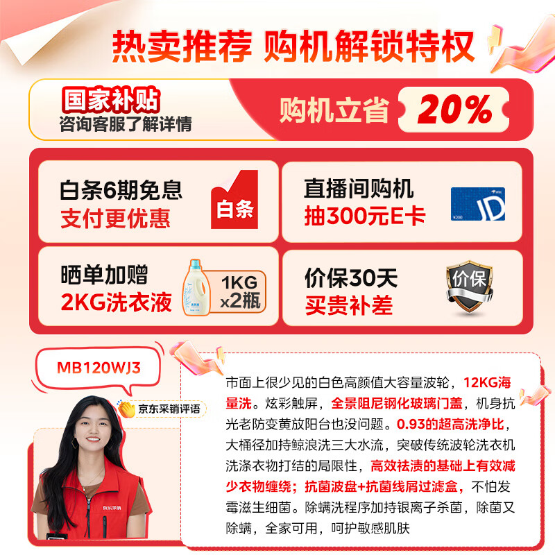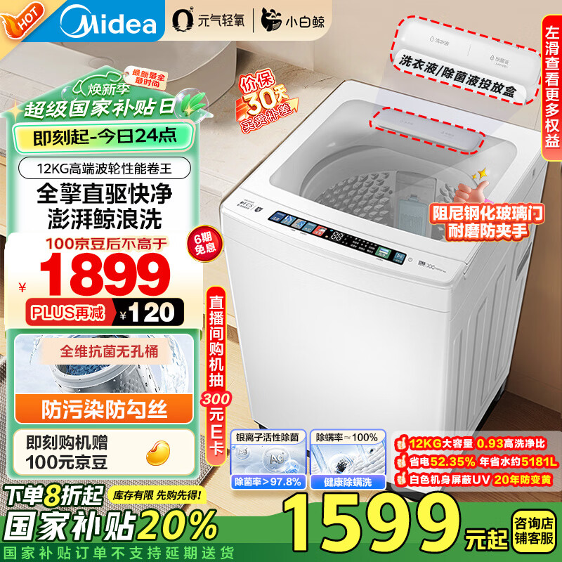 美的(Midea)波轮洗衣机全自动家用 小白鲸MB120WJ3 12KG大容量元气轻氧 直驱变频 以旧换新 家电补贴20%价格:1999.00元!
