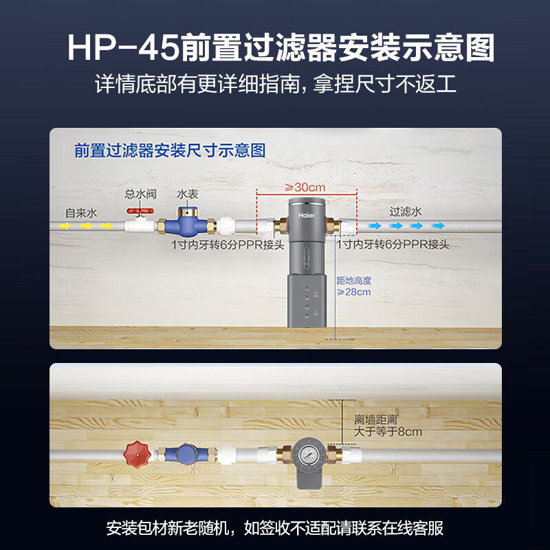 此款海尔HP-45外观我比较的喜欢,质量非常的好,预留位置刚刚好,提前预约上门安装很快。试了一下,反冲洗功能很好用,冲洗出水很冲。有水压显示,发现我家水压不小,就看以后入住后效果了。出水速度:感觉没有什么影响。