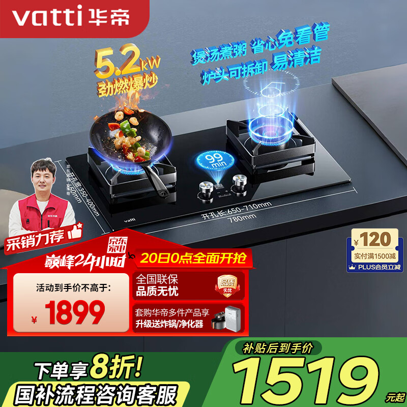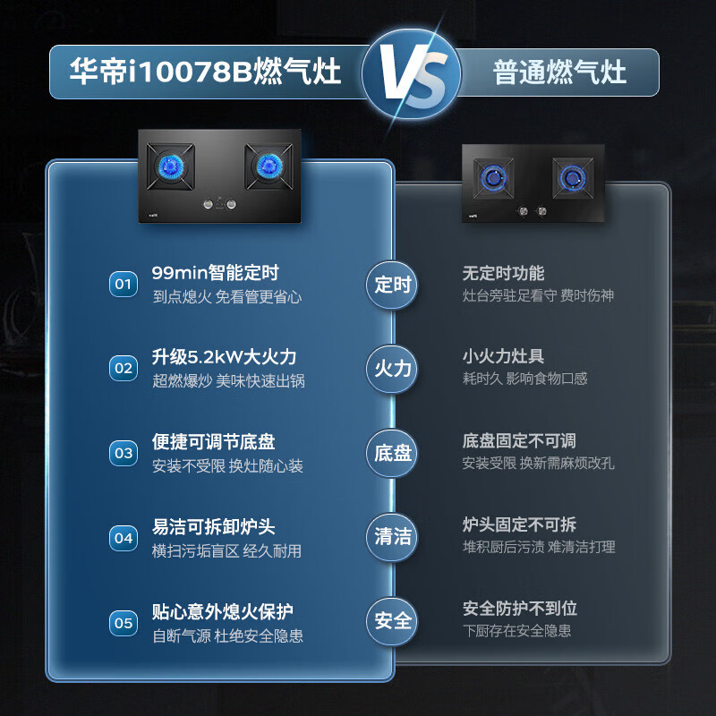 华帝(VATTI)政府补贴官方家用定时燃气灶天然气双灶嵌入式5.2kW一级能效童锁保护灶具灶台以旧换新i10078B价格:1899.00元!