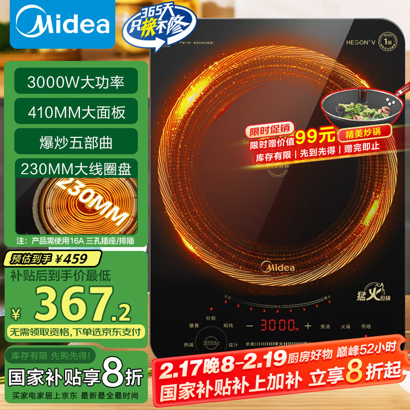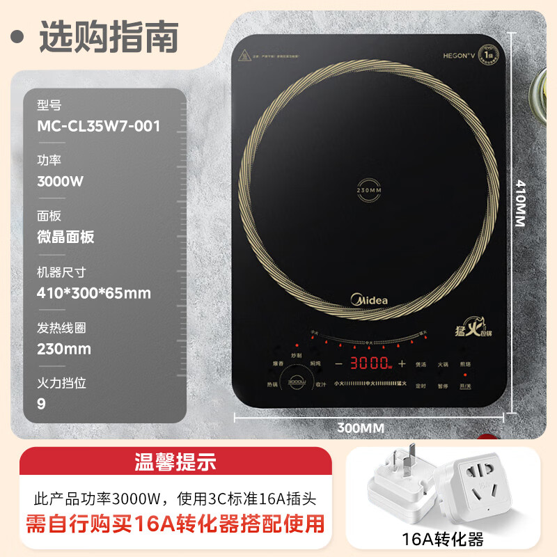 美的(Midea)电磁炉电陶炉 商用/家用猛火爆炒3000W大功率 电磁灶 匀火加热大面板大火包锅补贴CL35W7-001价格:459.00元!