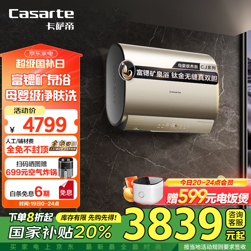 卡萨帝(Casarte)60升【CJ7】补贴速热储水式电热水器家用超薄双胆扁桶型13倍增容富锶泉一级能效CEC6005-CJ7U1价格:4799.00元!