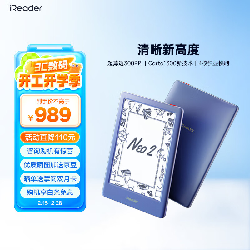 掌阅iReader Neo2 6英寸 电子书阅读器 墨水屏电纸书 平板学习笔记办公本 轻量便携 32GB 海岛蓝价格:989.00元!