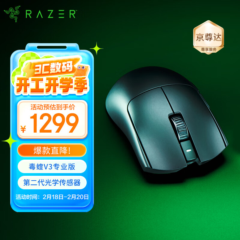 雷蛇(Razer)毒蝰V3pro专业版无线鼠标 8K 电竞游戏轻量化鼠标 类肤材质 cs2 无畏契约 黑神话悟空 黑价格:1299.00元!