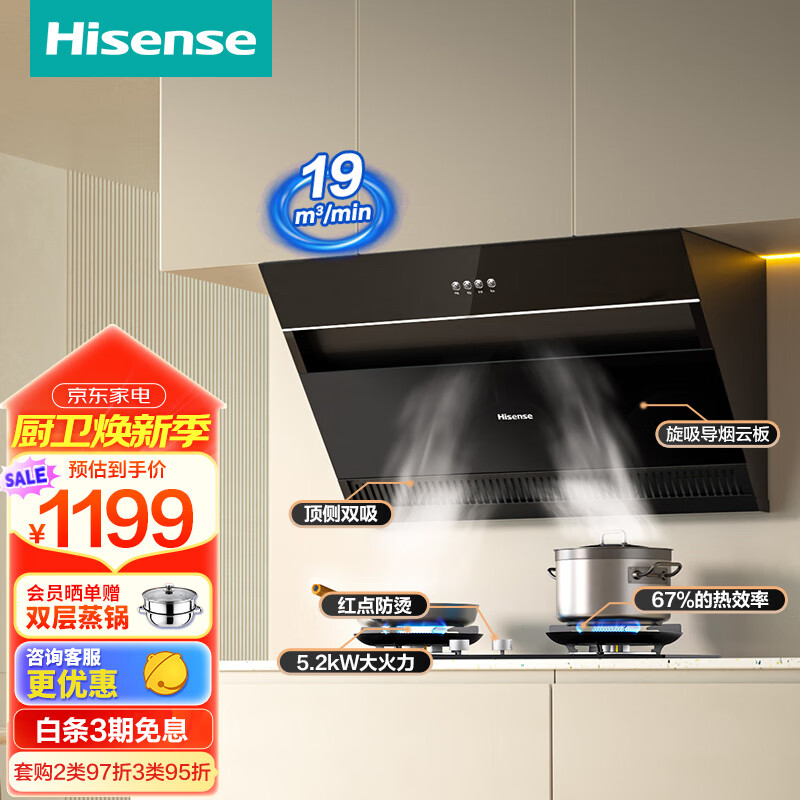 海信(Hisense)抽油烟机 家用大吸力19立方侧吸式吸油烟机小户型老式厨房换新5.2KW大火力瞬燃烟灶套装905A+DB32价格:1299.00元!