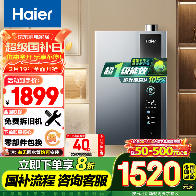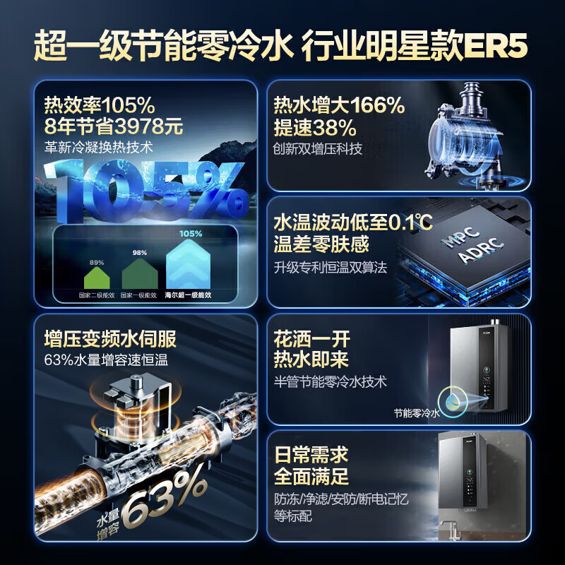 海尔(Haier)16升【国补立减20%】【ER5】零冷水燃气热水器天然气 超一级能效增压水伺服JSLQ27-16ER5DLRCU1价格:1899.00元!