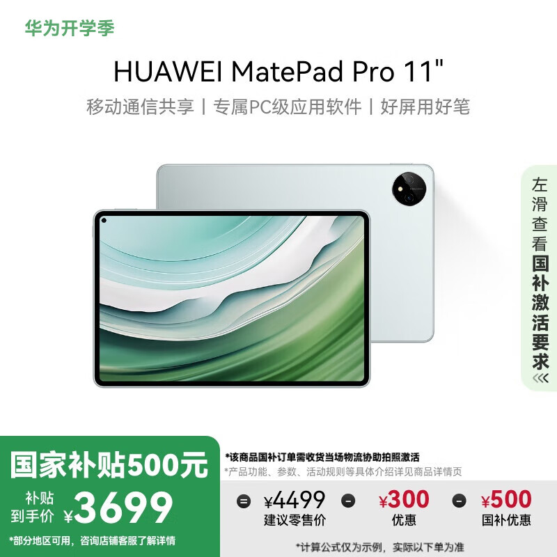 HUAWEI MatePad Pro 11英寸2024 补贴500元 华为平板电脑2.5K屏办公学习12+512GB WIFI 雅川青价格:4199.00元!