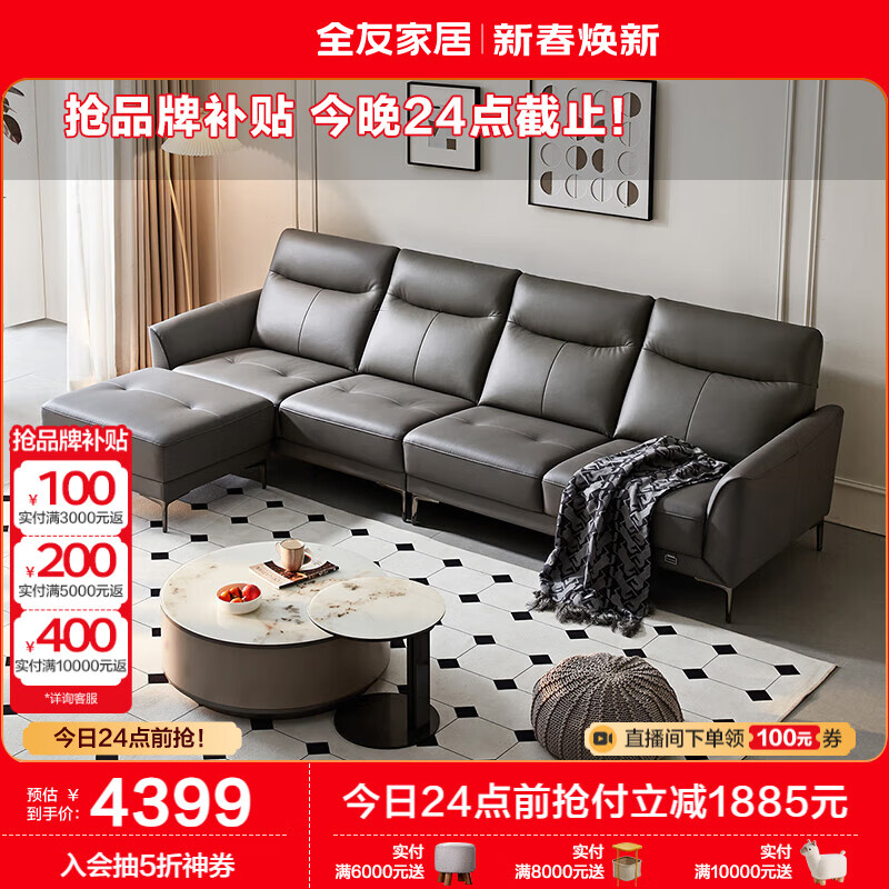 全友家居 真皮沙发客厅小户型直排式轻奢风四人位皮艺一字沙发102710E价格:6284.29元!